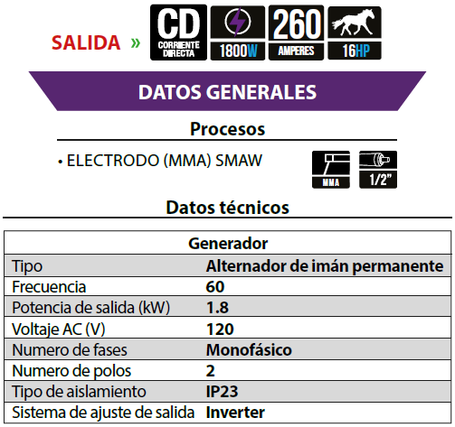 • Equipo para trabajar procesos MMA (SMAW) en aceros al carbón, aceros inoxidables, aluminio y electrodos especiales.